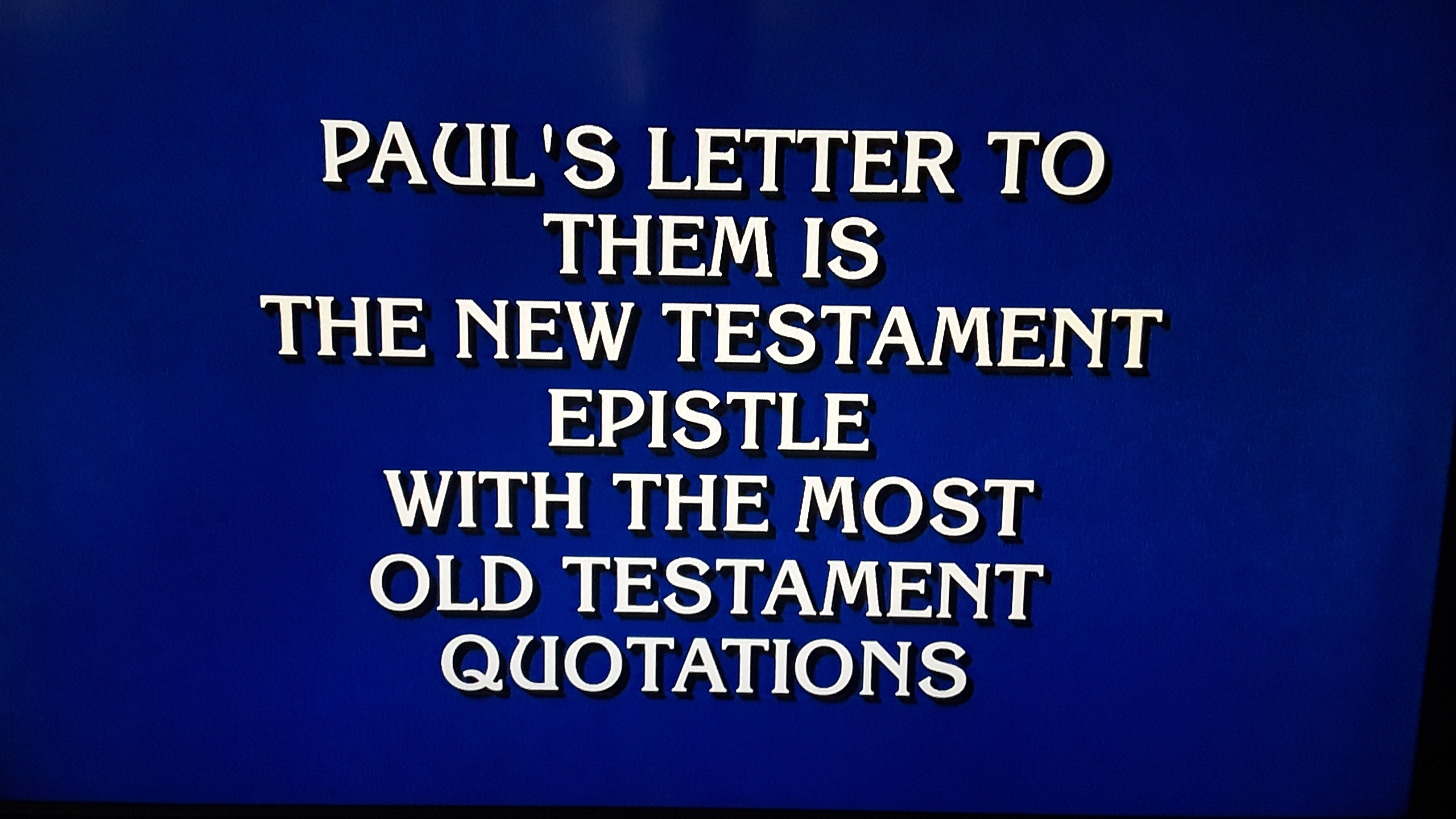 What is Hebrews? The authorship of Hebrews is highly debatable. The short answer is the bible doesn’t say. The 13 epistles from Romans to Philemon identify Paul as the author. If he wrote Hebrews, why do so anonymously? The letter is certainly pauline in style and it could have easily been written by a contemporary of Paul or a student that he mentored. The commonly held scholarly belief in modern times pretty much rejects Paul as the writer. Enter Jeopardy. The clue above was not just on Jeopardy the other night; it was the Final Jeopardy round during the multi-episode Tournament of Champions. I wasn’t surprised to see the Church Leaders website weigh in on Thursday. I am a little surprised to see the controversy grow to the point CNN considers it news. Jeopardy Bible clue sparks hellfire debate over New Testament reads the New York Post headline.