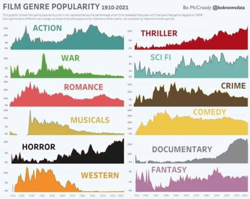 Movie Genres of the Past Century – The resolution of this image may not let you clearly read the graph numbers but you can easily follow the trends. Notice the way documentaries took off in the last 30 years. Westerns have almost flatlined but every now and then… I saw Tombstone in the theater back in 1994 and I happen to like the Jeff Bridges True Grit remake. That’s not to say I don’t like True Grit starring John Wayne and its sequel Rooster Cogburn but some people feel that new movies ruin older ones.
