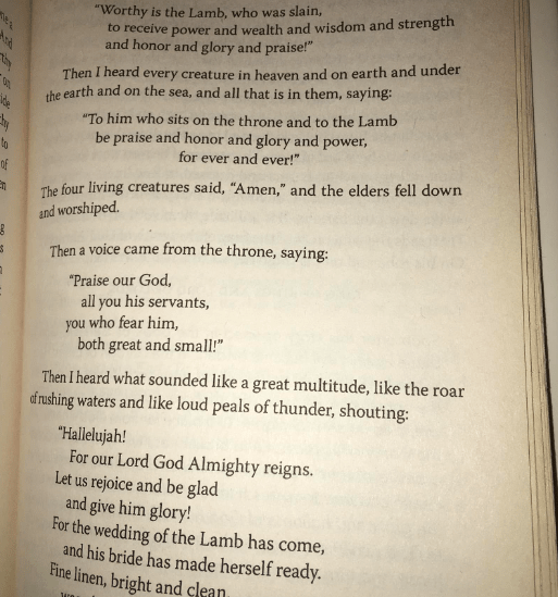 How do you feel about that text? You may recognize it from Revelation. There are no chapter or verse numbers but that’s often the case with a paraphrase. Sometimes a paraphrase is helpful but one needs to know the difference between types of translation and what a paraphrase is to use one effectively. The sample above is from NIV’s The Story. It’s a pretty straightforward translation with not a lot of paraphrasing going on, at least not on this page. Here is the problem: In the middle of that page you get to the end of Revelation 5. The next words pick up at Revelation 19:4. Paraphrasing is one thing but Revelation has been heavily redacted with 13 chapters missing from a book that’s only 22 chapters long. Now, in the interest of full disclosure, the image above was posted online by a concerned reader. I have not held The Story in my hand, flipped through the pages or read anything about the publisher’s methodology. I may not have the full story but i know what happens in the middle of that page with seemingly no indication or explanation.