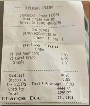 That’s more than inflation. The cost of two coffees was less than $11. It was the $4,444.44 gratuity that wiped out Jesse and Deedee O’Dell’s debit card. The kicker is they didn’t notice right away. It was a few days later when Deedee was shopping with her kids that her card was denied. Then they discovered the total bill from Starbucks was $4,456.27. It gets worse. Starbucks acknowledged there was a glitch in the system and sent two checks that totalled the amount of the tip. When the O’Dells deposited those checks… they bounced. They have been promised replacement checks but as of yet they have not arrived. In the meantime they had to cancel an international trip and lost their non-refundable airline tickets.