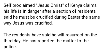 Eliud Simiyu is the self-proclaimed Jesus of Tongaren from Bungoma. Some locals have suggested he be crucified as Jesus was, reassuring him that if his claims are true he will be resurrected on the third day. Understandably he has express concern for his life. Orphaned as a child, Simiyu was struck in the head during a domestic dispute in 2009. After being released form the hospital he began preaching. He later claimed to be Jesus, identifying himself as a “divine being” and claims to have miraculous powers. On one occasion, according to witnesses, he turned water into… tea. You know what they say, it’s all fun and games until a mob wants to crucify you on Easter to see if you are really Jesus.