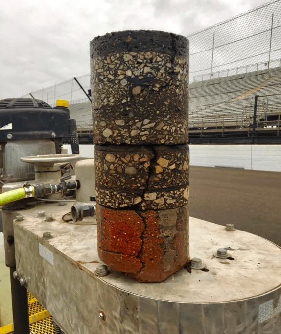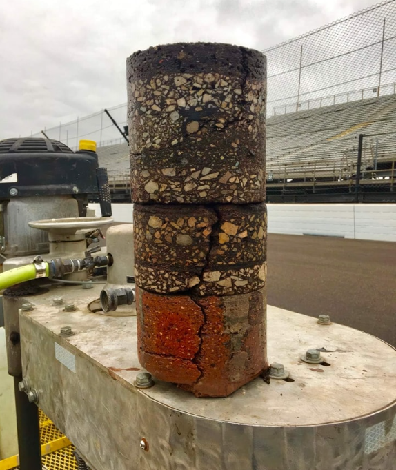 The cylindrical core sample shown was indeed taken at Indianapolis but let the record show that was done in 2017. So it shows 108 years of history even though the track is now 114 years old. That’s just under 800 dog years.