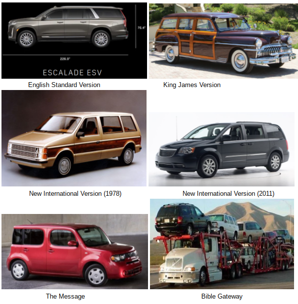 The Amplified Bible – The cars as Bible versions image you may have seen before. That’s one of mine and I shared it in a comment thread last week. Ricky Pope of Christian Nerds Unite replied with the minivan full of speakers and called it The Amplified Bible and all I could do was respect.