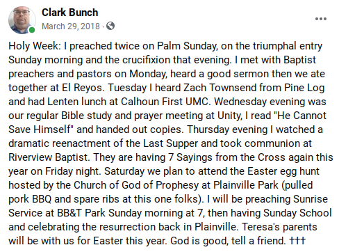 I mentioned Facebook Memories earlier. I rely on that feature, in addition to the extensive archive of blog posts, to supplement my own faulty memory. I have lots of pictures stored on Google Drive. Reflecting on the post shown above, Holy Week 2018 must have been epic. I might remember each of those events individually but not realize they all happened in the same week. Holy Week was filled with activities at OBI because we had chapel five days a week and twice on Sunday. The first year I pastored at Unity I had to fit all the Holy Week ideas I had into four meetings: Palm Sunday AM, PM, Wednesday Bible Study then Easter Sunday.