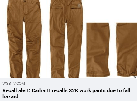What?!? Apparently the work pants, sold over a six month period of time last year, have an elastic strap at the ankles that can fall down, create a loop, and trip the person wearing them. If you have the $70 Carhartt work pants affected by the recall you can return them for a refund or show proof of purchase to get the refund and keep the pants.