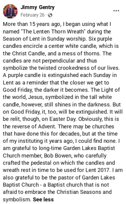 I attended a Good Friday worship service last night at the end of the service the pastor extinguished the Christ candle. I had never seen that before but considering how we light the Christ candle in the center of the Advent wreath on Christmas Eve or Christmas Day it makes sense. Here is the explanation posted by pastor Jimmy Gentry: