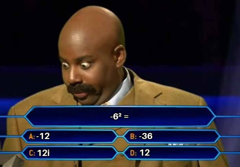 Math is hard. I had a math teacher friend that wanted people to stop saying that. I actually have it on a t-shirt but I propose math is hard and sometimes it’s worth learning to do hard hard things. Teach it well and when students succeed it’s not because the subject is easy but because they were able to achieve. At any rate, everyone needs to quit sharing images like this one on Facebook. People will either get the answer correct or they will get it wrong and argue with the people that try to explain it. It’s always order of operations problems. Comments shout things like “USE PEMDAS!” in all caps, then proceed to do it wrong anyway. The correct solution above is -36. It’s a real technical detail that I didn’t teach 8th graders when teaching order of operations for the two or three days we spent on this. Technically the question is asking for the negative of six squared. If you wrote (-6)2 = then 36 would be correct.