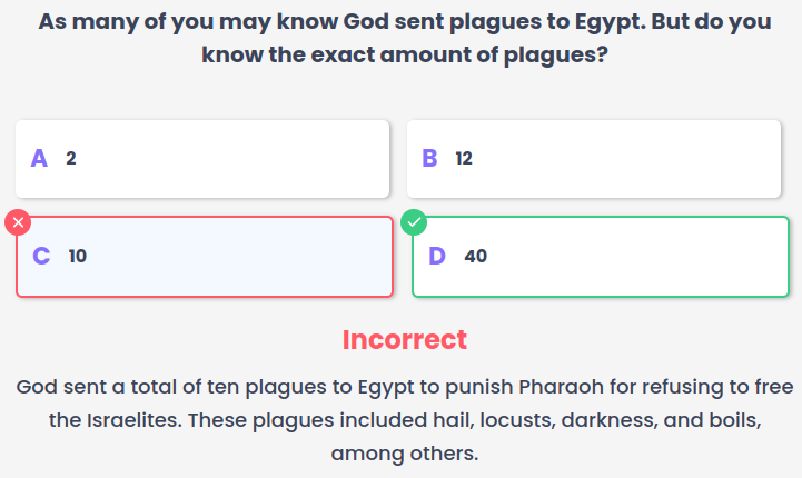 Online quiz is sus – I clicked on one of those stupid quizzes that show up in Facebook newsfeeds. It was Bible trivia and not asking for my pet’s name or the street I grew up on. (If you don’t know why you should not respond to those kinds of questions, ask me in the comments.) I think I scored 37 correct out of 40. One question I legit got wrong; looked it up, I was mistaken. One question I didn’t like the answers so I would deem that question and answer confusing. Then there’s the question about plagues in Egypt. The correct answer is 10. I picked C: 10. According to the graphic above, C is wrong and the correct answer is D. Then the explanation goes into why 10 is correct. And that’s why I got 37 responses correct and not 38.