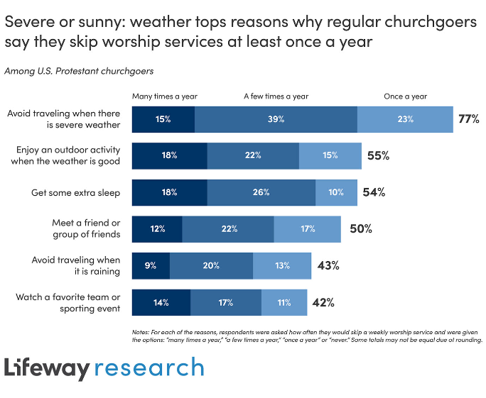 According to the Christian Index weather is the number one reason that folks skip church. Severe weather is #1 and enjoying good weather is actually #2. So people are most likely to come to church when the weather is merely so-so. Sleeping in a close third. Read the full article here.