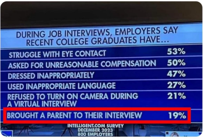 Nearly 1/5 of recent college grads have brought a parent with them to a job interview. A young man or woman going to their first interview may not know any better; but parents, come on. Send Junior in there like a big boy. At least wait in the car.