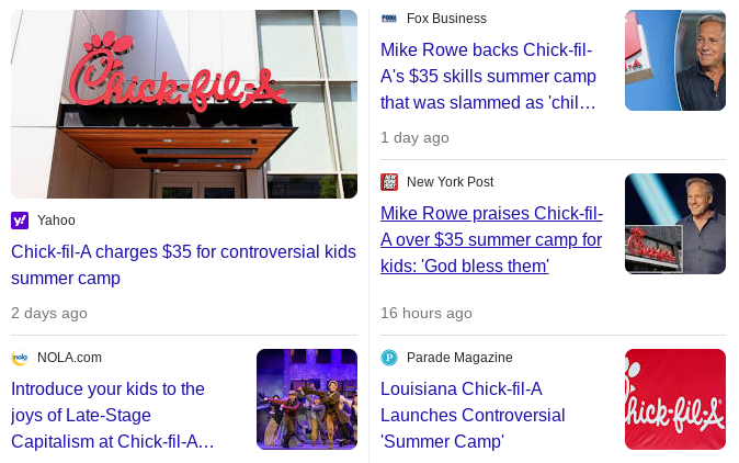 Camp Chick-fil-A – I’m gonna chalk this story up to a slow news week. The “news” here is about the social media outrage over a Chick-fil-A in Hammond, LA, offering a 3 hour summer program for kids to learn what it’s like to work at Chick-fil-A. For $35 kids can see what it looks like behind the scenes in Chick-fil-A’s kitchen, meet the cow mascot, meet the owner/operator, and of course get a free meal and a t-shirt. Critics jumped all over the camp announcement post on Facebook talking about child labor, corporate greed and one person even tagged the department of labor. A Chick-fil-A in Houston, TX, started having the camp a few years ago and all 200 spots sell out in a manner of minutes. The Hammond, LA, Chick-fil-A sold out all their spots within 24 hours and added additional dates. Mike Rowe (and many, many others) have come to the defense of Chick-fil-A for offering something fun during the summer that kids enjoy and that offers the “soft skills” young adults need in work environments. Chick-fil-A corporate has responded to the child labor complaints by pointing out that kids in the summer camp program will not be doing the actual work of a team member.