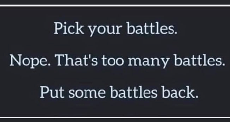 “Pick your battles” was the only advice my dad gave me when I got married. “You cannot win, and should not fight, every battle.” I decided that was good advice that I would take to heart.