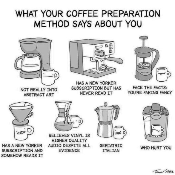 Cartoons about coffee would normally be Van Til’s thing but this image is too much information to process on a Monday morning. I don’t get the dig at Keurig but what this post is missing is an entry for “here’s how a perfectly normal person prepares coffee at home each morning.”