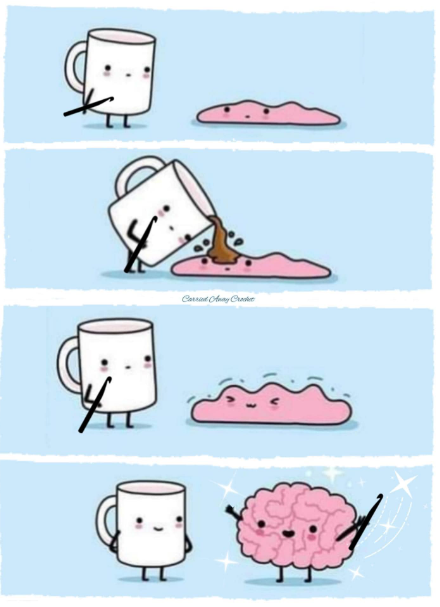 We had some discussion in The Master’s Table compound about this image Sunday evening. It looks like after the brain wakes up, the coffee mug hands him (or her) a crochet hook. Coffee has brought the brain back to life and now it’s crochet time? What do you think?