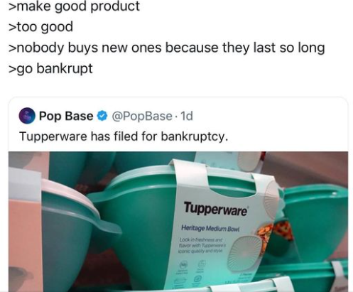 That’s not exactly what happened. Tupperware suffered an image problem. My mother and grandmother owned Tupperware products and as far back as the 1960’s my mother went to “Tupperware parties.” The products were well made and lasted a long time but I think shoppers today associate the brand with their grandmothers. Abercrombie and Fitch is an old company that it made itself relevant again by rebranding as A&F. Another issue may be cost. Tupperware is well made but not exactly cheap, and today Zip Lock and others make disposable containers that don’t have to be washed and can simply be thrown away. We’re talking about leftovers here and an empty margarine tub will work just as well as overpriced Tupperware.