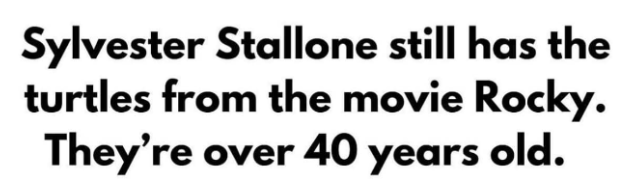 I really wanted this story to be true… but it’s not. What is true is that (as of 2021) the red eared sliders Cuff and Link were still alive and well. Stallone says they make an appearance in the 2018 film Creed II. Although he posted the pic to his Instagram account he never meant to imply he owned and cared for the turtles himself. Joseph Marks who was the original owner, and the owner of J&M Tropical Fish where Adrian worked in the movie, says the turtles were loaned to the film and returned afterwards. The two females were about five years old at the time in 1976. Marks’ nephew John Stuart has cared for them all these years. So all the details of the meme are true, the turtles are alive (or were) in 2021, that is Stallone pictured with them, he just never claimed they had been his pets all this time. As fake stories go this one is not so bad.