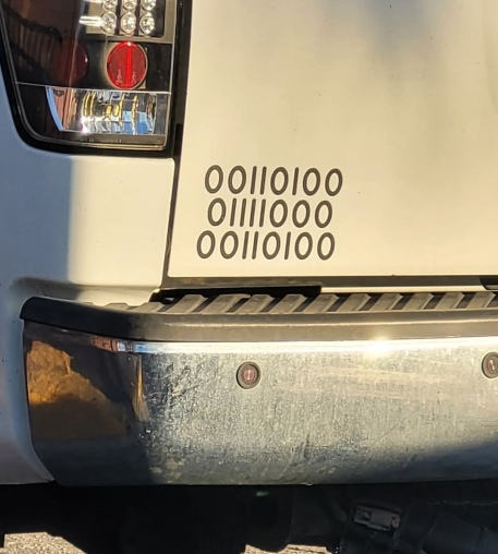 4X4 – On the tailgate of this pickup is binary code representing the ASCII code for the numbers/letters 4 X 4. It is kind of nerdy, most people will not get it but the fact it’s on a 4 wheel drive pickup truck should help. In the comment thread where I first saw this was the statement “Nerds shouldn’t be allowed to drive pickups.” Excuse me sir, I can be a nerd and a redneck. The two are not mutually exclusive.