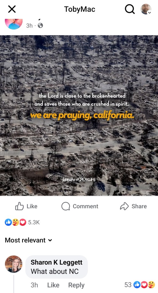 When Toby Mac says “Pray for California” it’s not a slant against anyone else in the country that needs prayer. He is not endorsing Hollywood and saying he couldn’t care less about Appalachia. There is an ongoing natural disaster, people are hurting, several have died, and he asked his followers on social media to pray. I donated to relief efforts going to NC and know people that traveled there with church groups to deliver food and supplies. But now California is on fire and I can pray for them, too. It’s not just celebrities with million dollar homes; there are some hard working people that have lost everything. I have visited family in Modesto, California, and attended a Primitive Baptist Church the Sunday morning I was there. They sang old hymns, read the KJV, the men wore ties and coats and the women wore dresses. It was a lot like the Baptist churches I grew up in in the South. Even if, even if, the fires are an act of God’s judgement it is not our place to judge but to pray for those affected by tragedy, share the gospel, and offer food, clothing and shelter as we are able. The comment above reminds me of this: