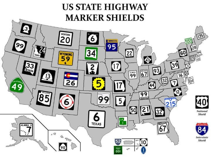 State highways in Georgia and Alabama have highway signs in the shape of the state. Florida signs are suggestive of the state without showing a whole picture, a little more artsy perhaps. Then you have states like Texas that just show you a number and write “TEXAS” at the bottom. This map shows what state highway signs look like in each state is just the right level of informative but not necessarily useful information I believe my readers are looking for on a Saturday morning. I could be wrong.