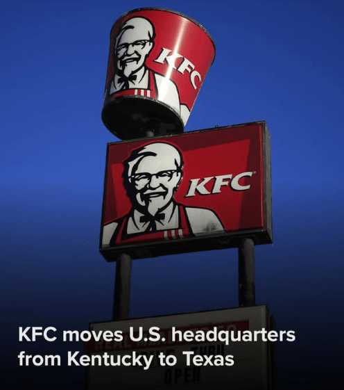 Kentucky Fried Chicken is leaving Kentucky, or at least its corporate headquarters is. KFC, PIzza Hut and Taco Bell were at one time owned by Pepsico and are now part of YUM! Brands. But in a world of shell corporations and subsidiaries, YUM! is not completely divested from its parent company. PepsiCo, Pizza Hut and Frito-Lay, along with many other companies not related to each other, are already headquartered in Plano.
