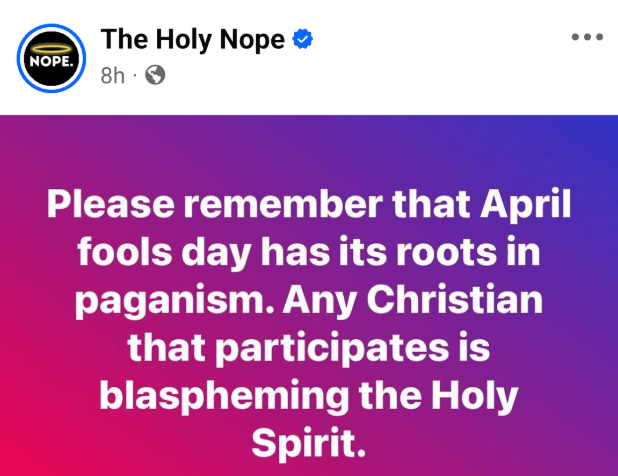 If you are unfamiliar with the Holy Nope, it’s basically Pastor Austin Keeler calling out foolishness on social media. I mean, he produces TikTok, YouTube Shorts and FB Reels that usually feature a short clip of someone on social offering up heresy or acting foolish in church. He uses comedy to draw attention to the fact the he is very serious about identifying the truth of scripture. He is pretty harsh on charismatics, women pastors and he is a hard line Calvinist. Which brings me to April Fools Day.