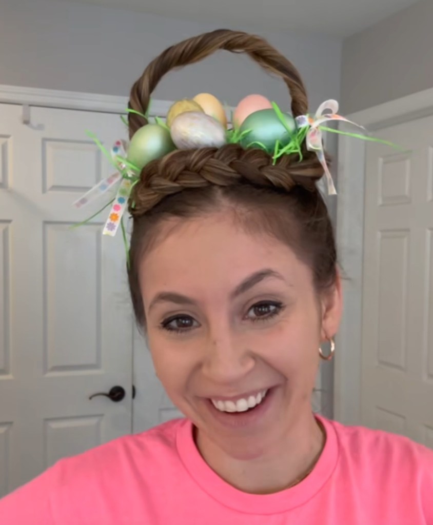 I’m no social media influencer and wouldn’t normally offer hairstyle suggestions, but if you are interested in Easter Basket Head you can easily Google up a tutorial. Sorry I lost the link. Or I never saved it start with, whatever.