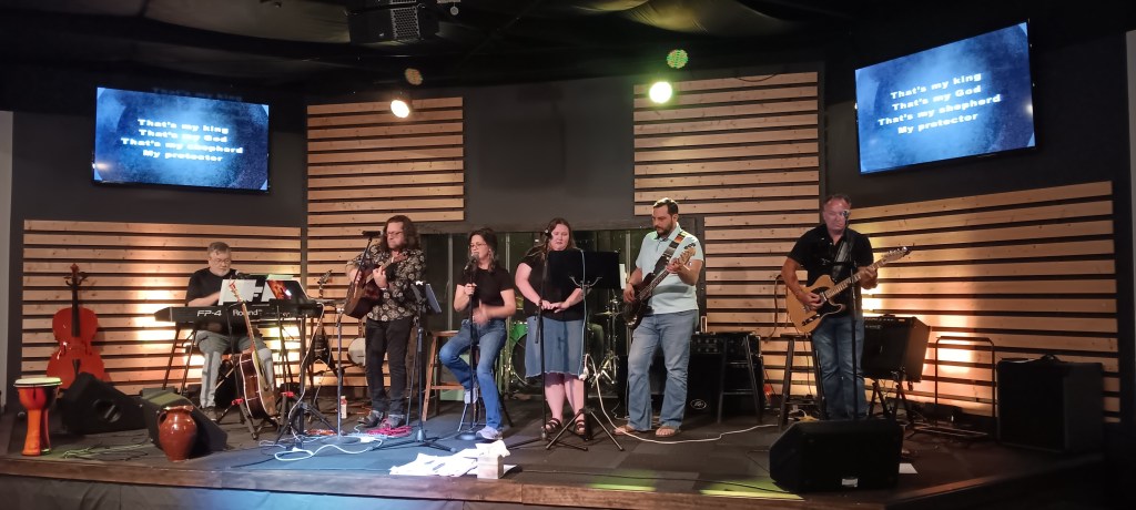 Here is what we did on Good Friday. I pastor a very traditional Baptist church; brick building, pews, chandeliers, piano on the left, very large wooden podium, baptistry behind the pulpit. This is the church my friend Stephen pastors. He is second from the left with the acoustic guitar. I thought, based on the flyer, there would be several elements of worship to this service; a few praise & worship songs, either a sermon or devotion, communion, “other.” This was basically a two hour concert with a self-serve communion station near the back that we visited during the last song. I don’t think there was a prayer time, not that everyone was led in together. Not what I expected but we worshiped with other like-minded believers which was the point.