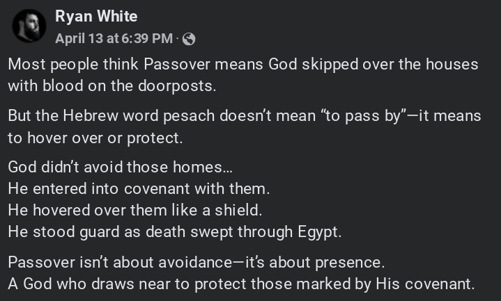 This has never been the Jewish understanding of Passover. The Passover feast commemorates the night God’s judgement “passed over” the Hebrews when the first born of every Egyptian died. For the Christian believer, the Passover lamb points forward to Jesus’s work on the cross. When the blood of Christ is displayed on our hearts, God’s judgement will pass over us at the final judgement. The image above may be inspiring or hopeful, but it diminishes the truth of God’s Word in order to do so. God will judge with a righteous judgement and that’s why salvation is precious.