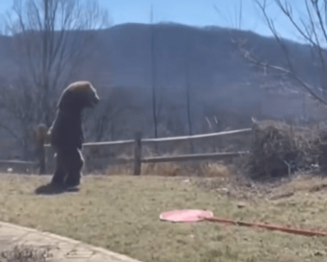 A man in Asheville, NC, had an uninvited guest, a bear that frequently came out of the woods and just wandered around or even laid in the yard. So he put on a bear suit – that’s him in the picture, wearing his bear costume – and chased the real bear away. The National Park Service recommends not doing that.