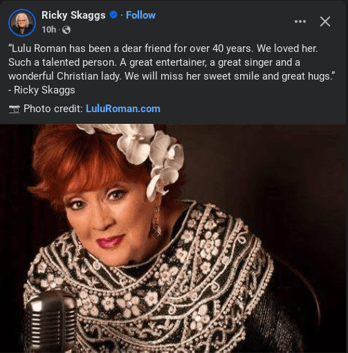 Lulu Roman – I saw this post on Friday morning and learned that Lulu Roman had passed away on Wednesday at the age of 78. I honestly did not know she was still around. She is probably most famous for singing gospel music on Hee-Haw back in the day but I have seen more recent pics of her with Dolly Parton and other contemporary artists. I don’t remember Ricky Skaggs having a full head of gray hair but I guess time marches on with or without our consent. Here she is at a Bill and Gloria Gaither Reunion in 2012.