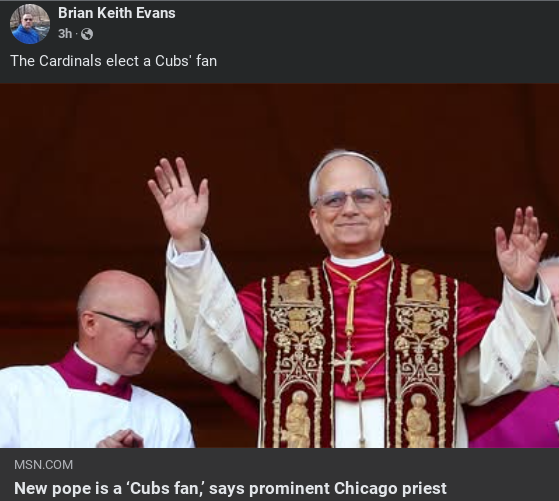 American pope – There is actually some debate whether Leo XIV is a Cub’s fan or not. The initial report seen here has been challenged by his brother who claims he is more of a White Sox fan. That would be more in keeping with his commitment to the underdog. I bet he has some strong feelings about deep dish pizza. That should go over well in Italy.