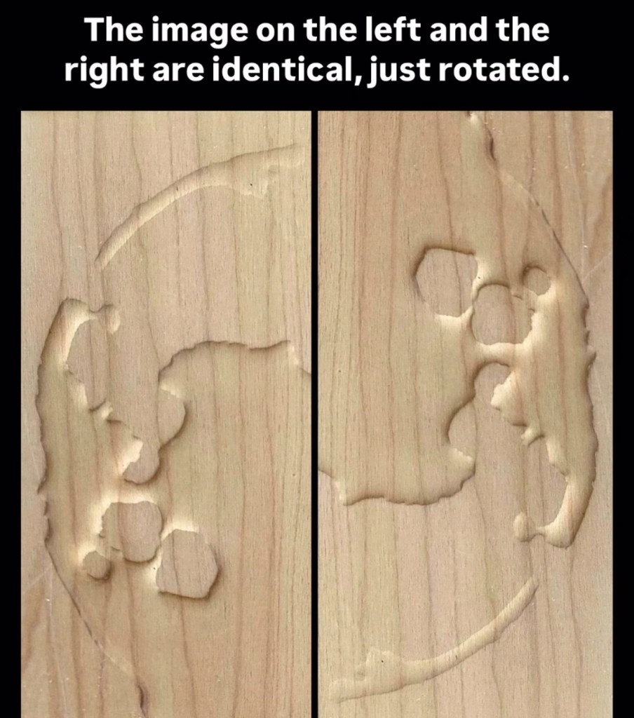 Here’s an illusion anyone can see. The parts that look recessed on the left appear to be raised on the right and vice versa. But it really is the same image. If you turn off the auto rotate feature you can flip the image and see for yourself. It has to do with the direction the image is lit from and how our brains perceive the reality of what is around us. If you are going to tell spooky stories around a camp fire, shine a flashlight on your face from underneath. It’s unnatural because natural light sources come from above.