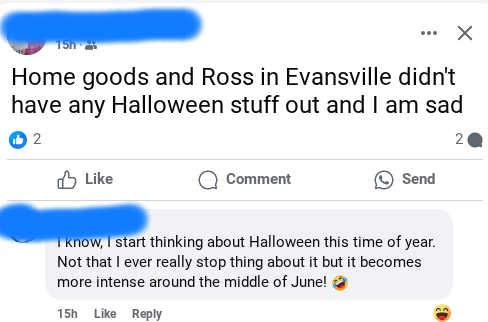 The truth is stranger than fiction. I may have moved on past middle age but I do not consider myself an old curmudgeon, yet. My friends and family in real life know that our home shows no signs of Christmas anything until after Thanksgiving and yes, I am unapologetically judging every single one of you that puts up a tree and starts playing Christmas music in October. I don’t fault the stores for putting decorations and merchandise out early because we need to be ready when the time comes; I’m a big advocate for planning ahead. Sometimes I wonder, throughout the year, who is buying this stuff now? The screen above is from my own Facebook feed. One of my FB friends was looking for Halloween stuff in the store this week and couldn’t find any. Look at the response: I cannot imagine thinking intensely about Halloween in the middle of June. I’m thinking about 4th of July right now, then it will back to school. We do start decorating for fall around the beginning of September but at our house – especially since we live in the church parsonage – it is generic fall stuff that will stay until Thanksgiving.