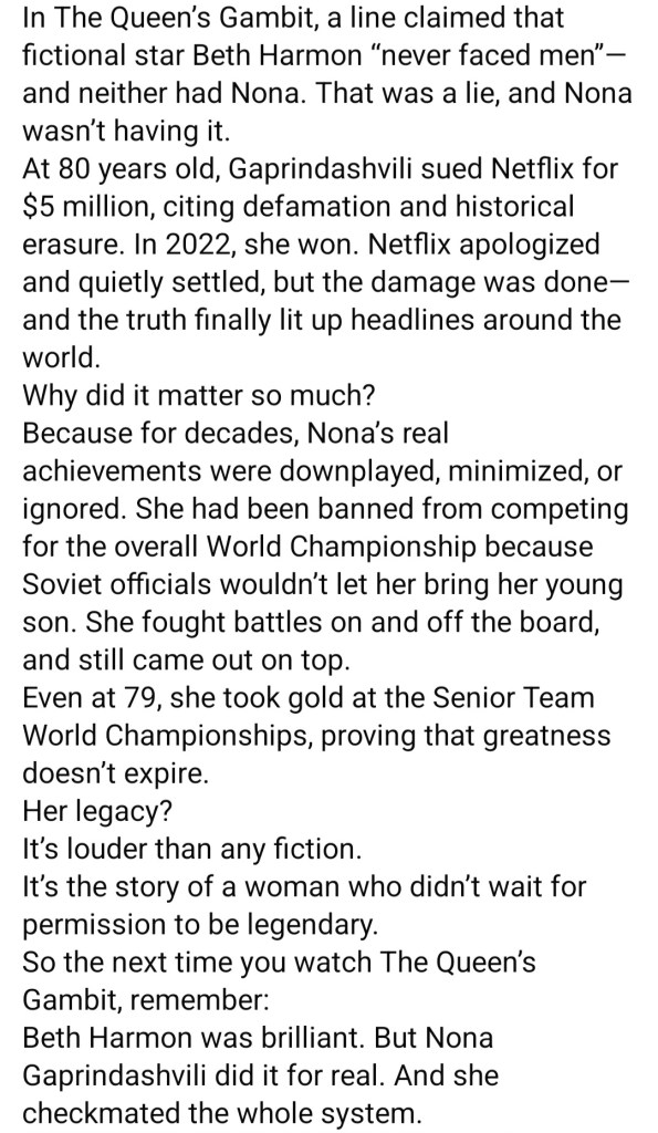 Nona Gaprindashvili was slighted in the movie The Queen’s Gambit and took her case to court, suing Netflix for defamation. Here is the rest of that story: