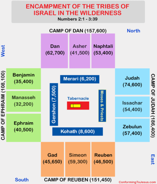 Yesterday we numbered all the men of Israel from 20 years and up that were able to go to war. Today we will plot where each tribe makes camp, always keeping the tabernacle at the center, and the order in which each breaks camp and sets out.