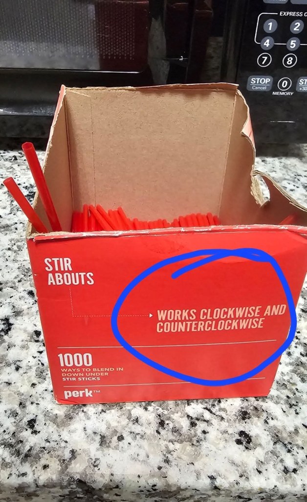 Well that’s good to know. I stir coffee first one way and then the other, just to be sure. BTW, this must be an American product. In the UK (and countries heavily influenced by the British) they say “anticlockwise.”