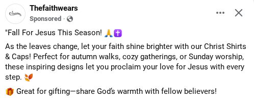 A company called Faith Wears claims you can use the fall/Halloween season to share the Gospel and your personal faith. I went to the website, which I will link to, and 90% of the merchandise is pumpkins and Jack-o-lanterns that has nothing to do with faith in anything. Some of the t-shirts are fall pics or Halloween images that says “Christ FALL-oweer” but has nothing of substance or value to Christianity. But this company wants to sells things, they know Christians like to buy things, and that’s all the thought that went into any of their products.