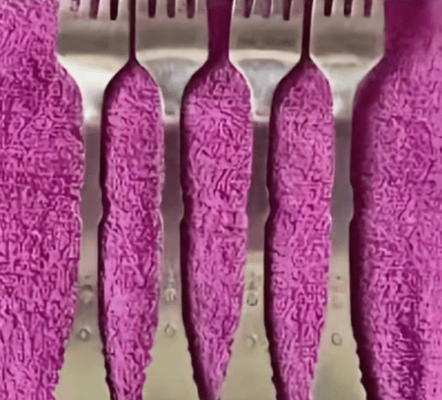 The mystery image is forks laying on a purple rug. I thought about cutting off the very top of the pic, I think the tines might give away but without them no one would every figure it out.