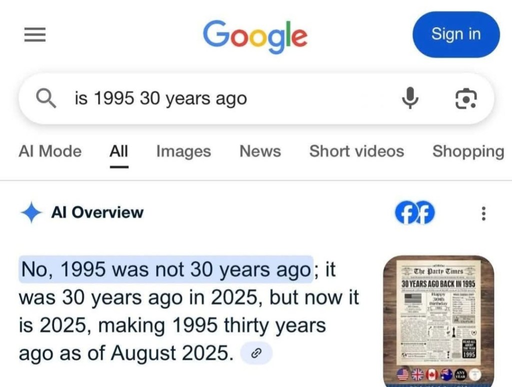 This has been fixed. If you Google that question now, it explains that yes, 1995 was 30 years ago. The AI summary goes to say that “some AI summaries” were incorrectly claiming 1995 was 29 years ago or in some cases 29 and 30 years ago. Sure.
