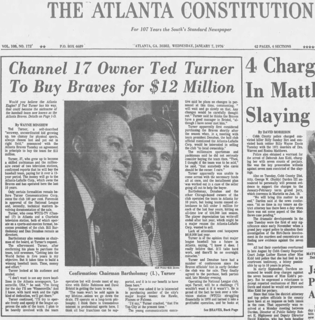 You can’t even get a good starting pitcher for $12 million these days. In 1975, Ted Turner bought a whole team for that price. The Atlanta Braves and Chicago Cubs still have national followings to this day because of Super Stations TBS and WGN respectively. Turner purchased the Braves in 1976 and the Atlanta Hawks in 1977 to provide programming for his local television station. TBS was originally broadcast over the air in the Atlanta before going national via cable and satellite in 1976. Oh for the good ‘ol days. The games were not any good most of the time but we could watch them for free.