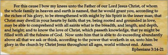 For this reason I bow my knees before the Father, from whom every family in heaven and on earth is named, that according to the riches of his glory he may grant you to be strengthened with power through his Spirit in your inner being, so that Christ may dwell in your hearts through faith—that you, being rooted and grounded in love, may have strength to comprehend with all the saints what is the breadth and length and height and depth, and to know the love of Christ that surpasses knowledge, that you may be filled with all the fullness of God. -Ephesians 3:14-19 ESV