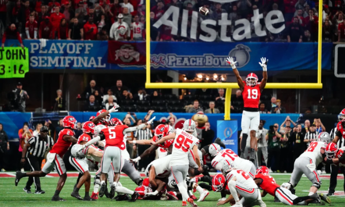 In New York at midnight the ball dropped. In Atlanta, it hooked left. That particular screen grab makes it look like a good kick but it didn’t just hook a little to the left, it was more like 20 ft. to the left of the pole. The Georgia Bulldogs beat The Ohio State Buckeyes 42 – 41 and won the Peach Bowl by a single point. The wide kick corresponded almost exactly to the countdown ringing in 2023. The CFP semifinals did not disappoint this year. At halftime OSU led 28 – 24 and it was close all the way down to the final minute. TCU upset Michigan like no one but TCU fans could have predicted.