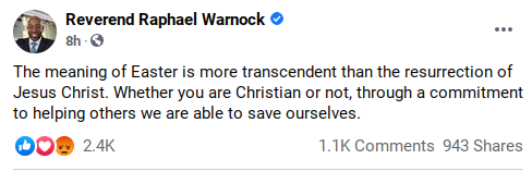 We are able to save ourselves. That’s what Senator Warnock of Georgia posted on Easter morning to Facebook and Twitter. Even after those posts were deleted – no clarification, no retraction, just disappearing posts – I continued to see screenshots of both for several days as people reacted online. During his campaign, Warnock reminded us many times that he served as pastor of Ebenezer Baptist Church in Atlanta, filling the pulpit of civil rights leader Martin Luther King Jr. He may be strong on civil rights but somewhat heretical on theology.