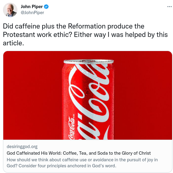 I saw a meme of John Piper in the pulpit, his hands are all over the place, and the caption said “God created coffee for the glory of Christ.” If you are familiar with Piper it kinda’ sounds like something he would say and since it’s about coffee you will probably see the meme first thing Monday morning. I thought I’d do about 10 seconds of research and see if maybe he really said it. The tweet above is real and he linked to this article not written by Piper himself but appearing on his Desiring God website.
